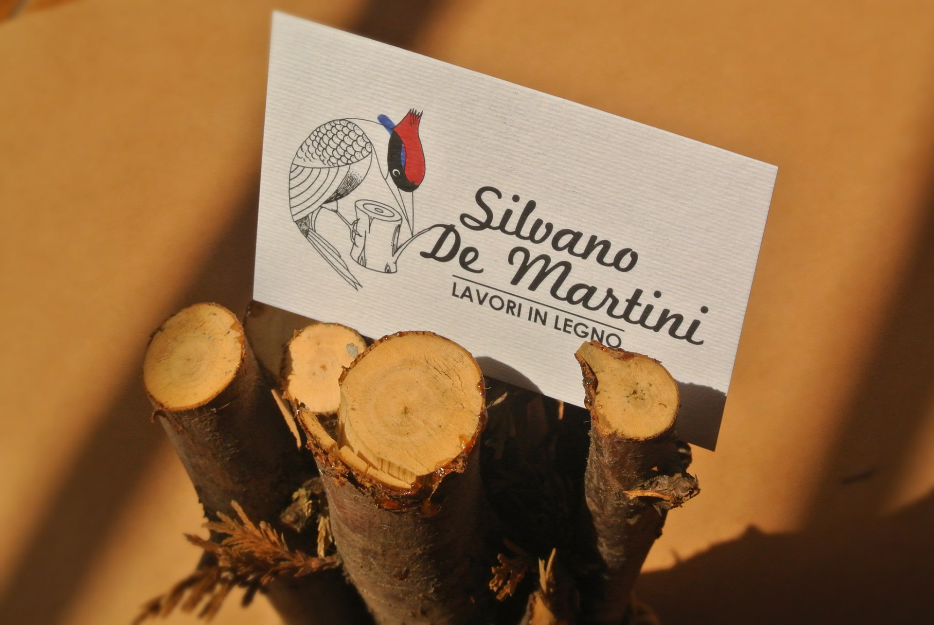 Business card for Silvano De Martini, Leivi (GE), carpenter. Illustration of a woodpecker